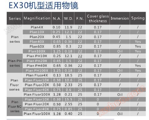 EX30 Biomikroskop, fluorescerande mikroskop optiska parametrar och konfigurationsförteckning